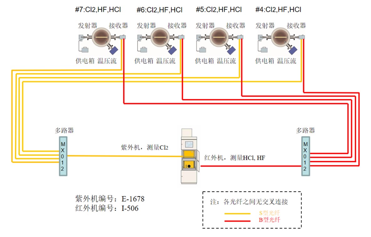 采用一套OPSIS SYSTEM 400在線(xiàn)監(jiān)測(cè)系統(tǒng),使用AR600紫外差分吸收光譜分析儀一臺(tái),搭配MX012多路器實(shí)現(xiàn)單臺(tái)分析儀連續(xù)循環(huán)測(cè)量多條煙囪的功能,該系統(tǒng)對(duì)#1~#3煙囪的NH3堿性氣體進(jìn)行一拖三的在線(xiàn)監(jiān)測(cè)。由于R型光纖的長(zhǎng)度有一定的限制,距離站房較遠(yuǎn)的#3煙囪使用快速循環(huán)回路(FastLoop)進(jìn)行監(jiān)測(cè)。